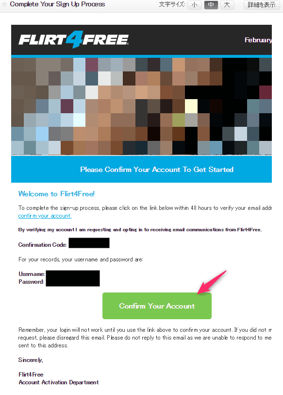 無料登録フォームでの作業が終わると、以下の画面が表示され、登録したメールアドレスにflirt4freeからメールが届きます